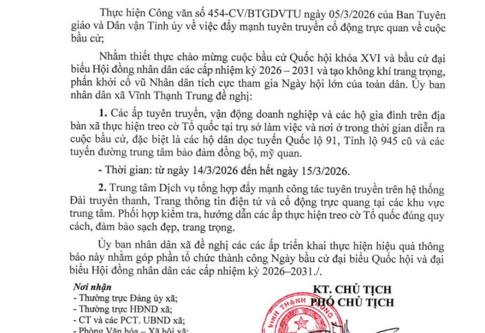 Từ ngày 06/03 đến ngày 10/03/2026, Ủy ban MTTQ Việt Nam xã Vĩnh Thạnh Trung phối hợp với UBND xã tổ chức Hội nghị tiếp xúc cử tri với những người ứng cử đại biểu Hội đồng nhân dân xã, nhiệm kỳ 2026 – 2031 tại 9 đơn vị bầu cử trên địa bàn.