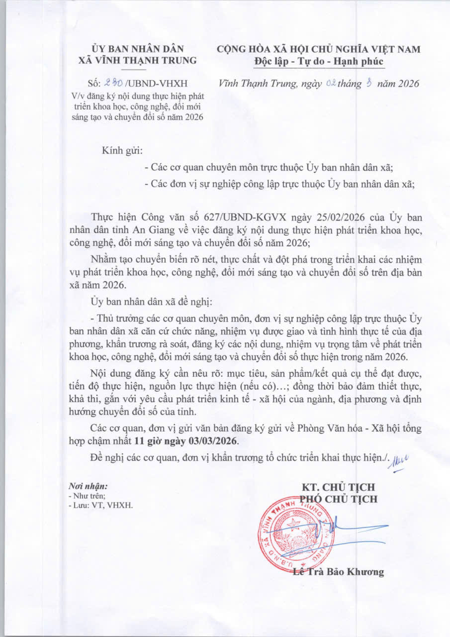 Công văn về việc đăng ký nội dung thực hiện phát triển khoa học, công nghệ, đổi mới sáng tạo và chuyển đổi số năm 2026