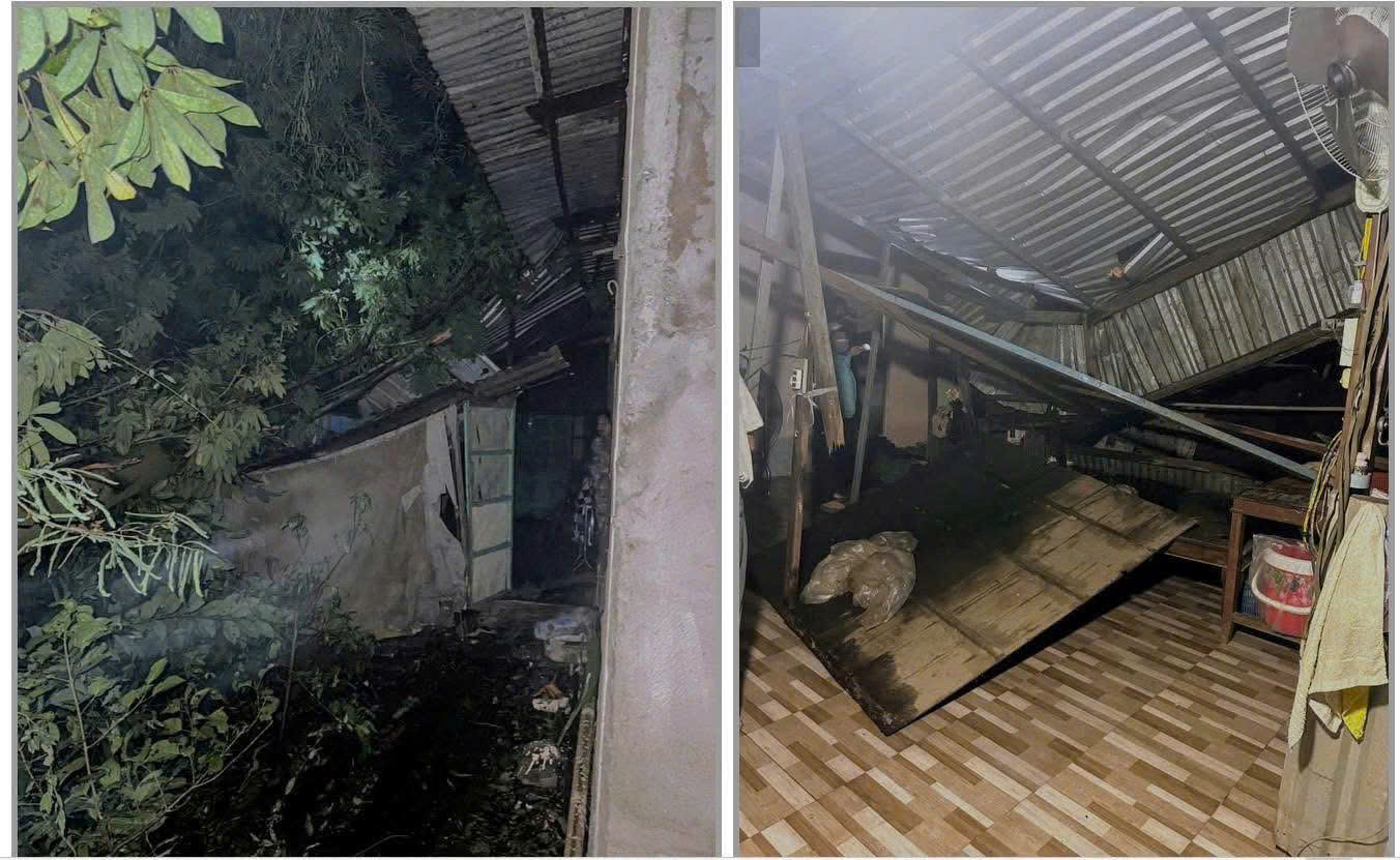 Cụ thể, giông lốc đã làm đổ ngã 02 cây gòn lớn, có bán kính khoảng 80cm, chiều dài gần 20m, được trồng trước cửa nhà cô Trần Thị Hoa Sen. Hậu quả, 02 cây gòn này đã đè trúng và làm sập một phần mái nhà của chú Trần Duy Dũng, căn nhà liền kề.