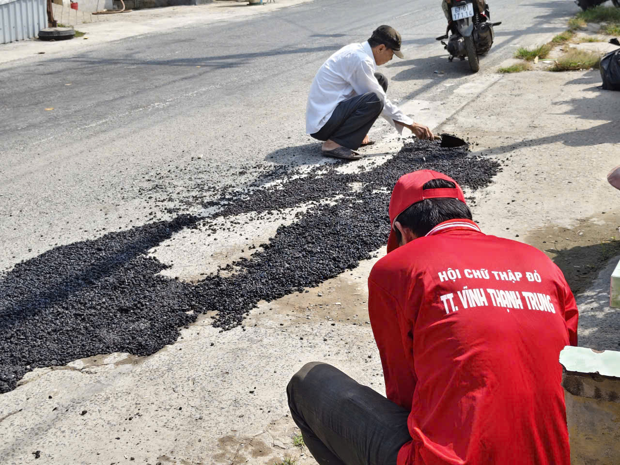 Trong hai ngày 25 và 26-4, Hội Chữ thập đỏ xã Vĩnh Thạnh Trung đã tổ chức dặm, vá các đoạn bong tróc, lấp các hố lõm để cải thiện mặt đường trên tuyến đường 945 cũ.