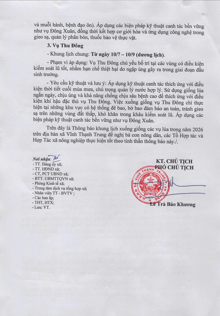 Thông báo KHUNG LỊCH THỜI VỤ XUỐNG GIỐNG CÁC VỤ LÚA TRONG NĂM 2026 02/12/2025 - aA + Submitted by Biên tập viên on 2 December 2025 Bài viết liên quan THÔNG BÁO VỀ VIỆC ĐO ĐẠC XÁC ĐỊNH DIỆN TÍCH CỦA ÔNG ĐẶNG VĂN DIỀN, KHU ĐẤT TOẠ LẠC ẤP MỸ THUẬN 10/12/2025 THÔNG BÁO TIẾP NHẬN HỒ SƠ ĐĂNG KÝ THỰC HIỆN DỰ ÁN: ĐẦU TƯ XÂY DỰNG VÀ KINH DOANH HẠ TẦNG KỸ THUẬT CỤM CÔNG NGHIỆP MỸ PHÚ 01/12/2025 Nội dung đang cập nhật 05/06/2023