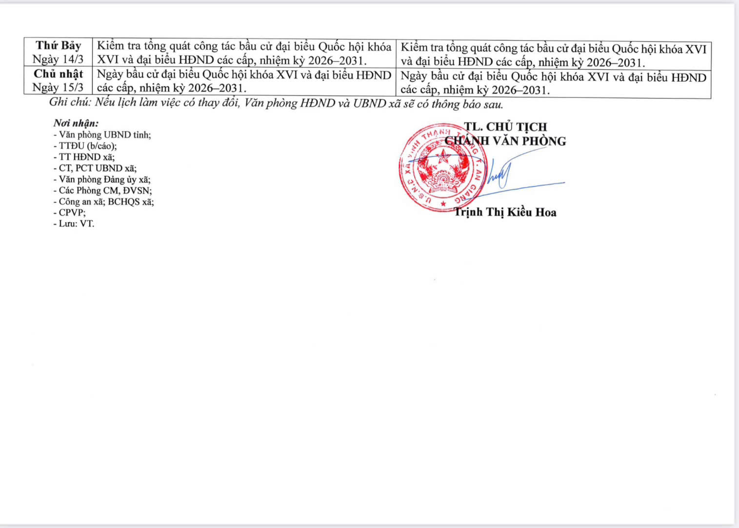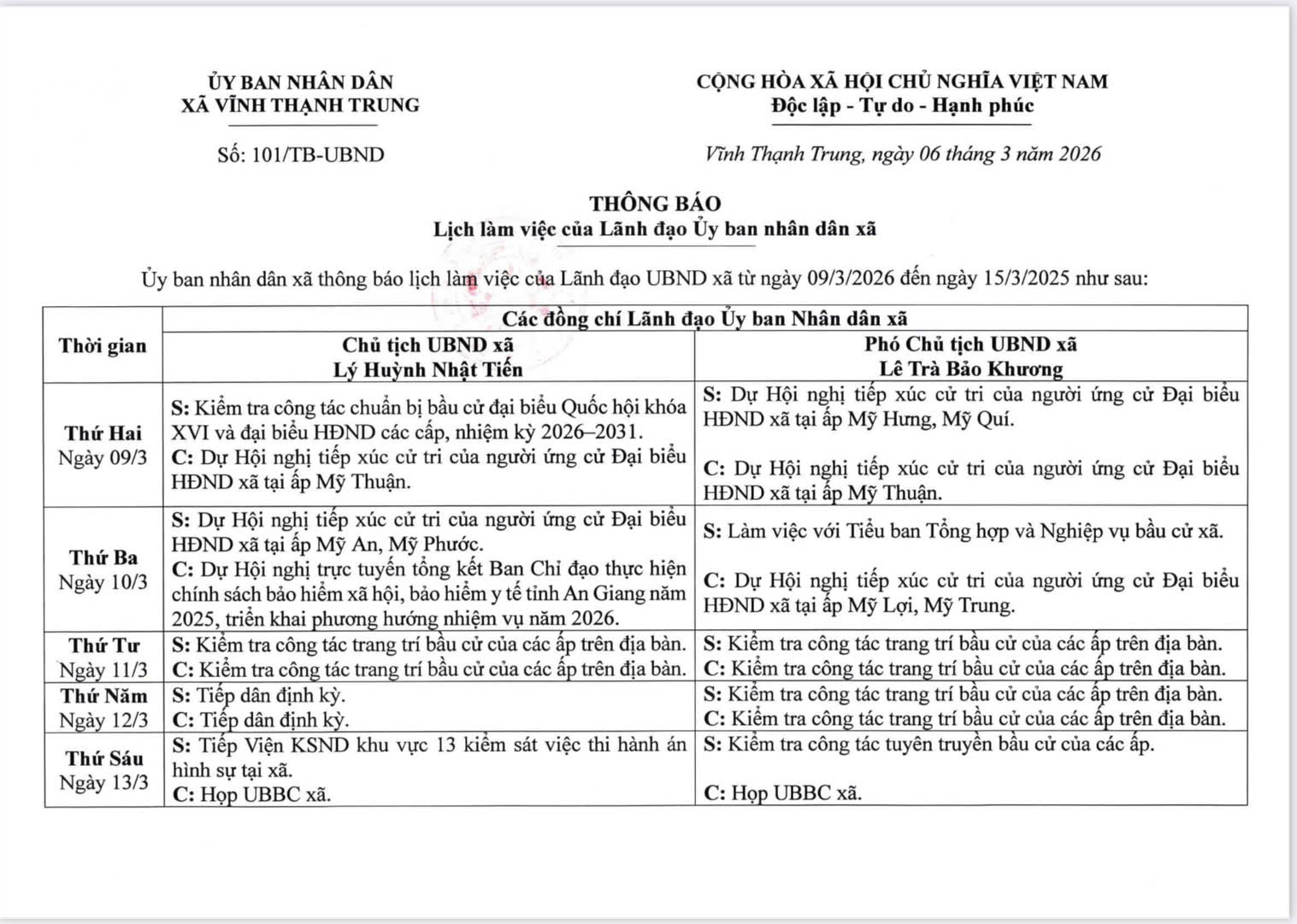 LỊCH LÀM VIỆC CỦA LÃNH ĐẠO UBND XÃ VĨNH THẠNH TRUNG TỪ NGÀY 9/3/2026 ĐẾN NGÀY 15/3/2026