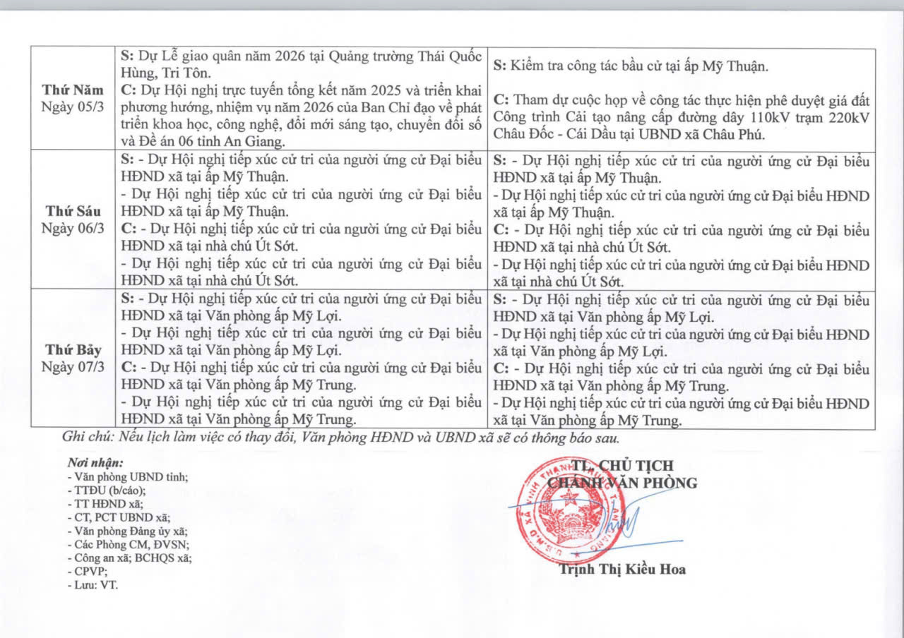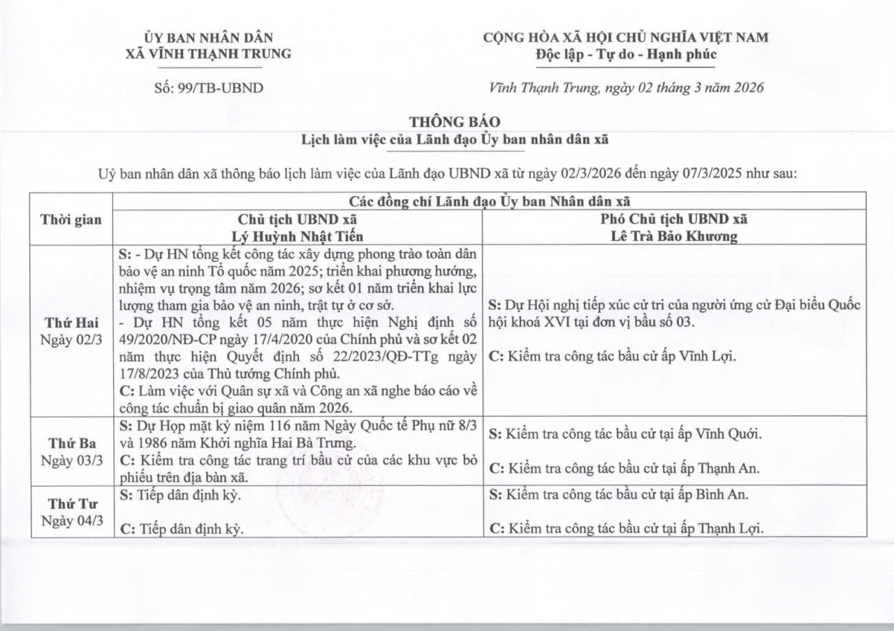 THÔNG BÁO LỊCH LÀM VIỆC CỦA LÃNH ĐẠO UBND XÃ VĨNH THẠNH TRUNG