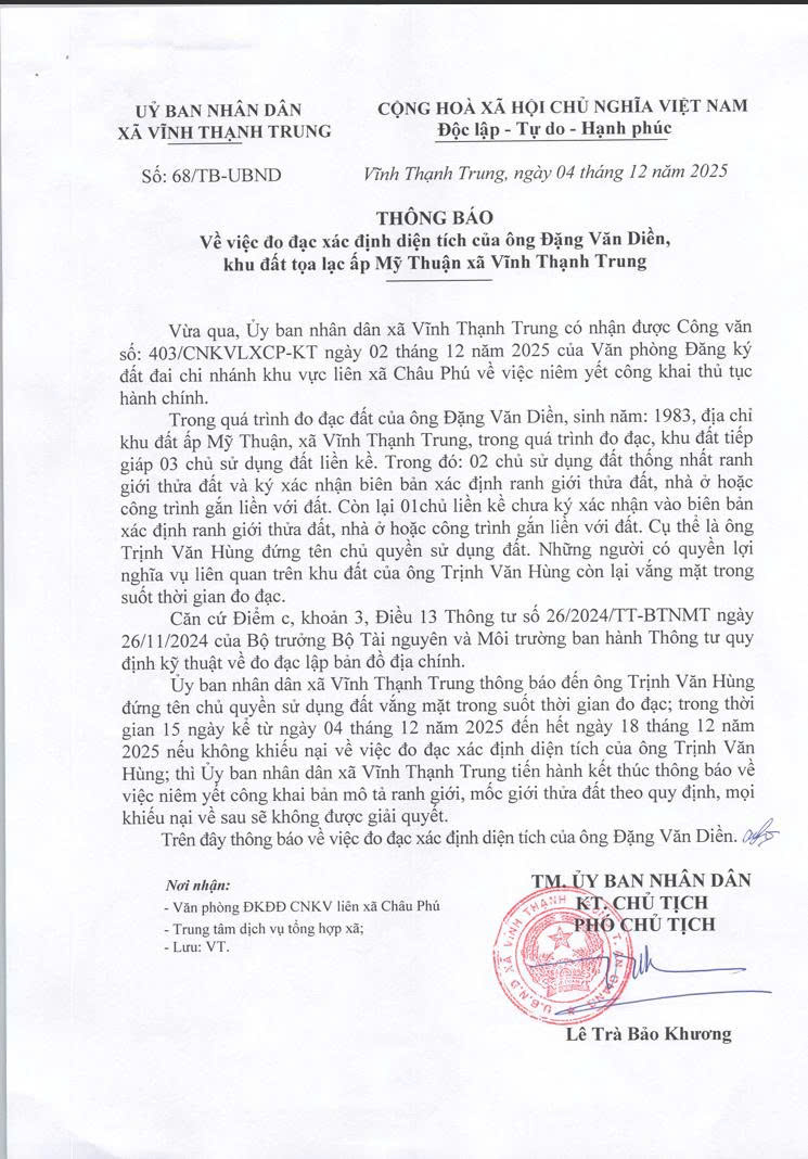 Thông báo THÔNG BÁO VỀ VIỆC ĐO ĐẠC XÁC ĐỊNH DIỆN TÍCH CỦA ÔNG ĐẶNG VĂN DIỀN, KHU ĐẤT TOẠ LẠC ẤP MỸ THUẬN 10/12/2025 - aA + Submitted by Biên tập viên on 10 December 2025 Bài viết liên quan KHUNG LỊCH THỜI VỤ XUỐNG GIỐNG CÁC VỤ LÚA TRONG NĂM 2026 02/12/2025 THÔNG BÁO TIẾP NHẬN HỒ SƠ ĐĂNG KÝ THỰC HIỆN DỰ ÁN: ĐẦU TƯ XÂY DỰNG VÀ KINH DOANH HẠ TẦNG KỸ THUẬT CỤM CÔNG NGHIỆP MỸ PHÚ 01/12/2025 Nội dung đang cập nhật 05/06/2023