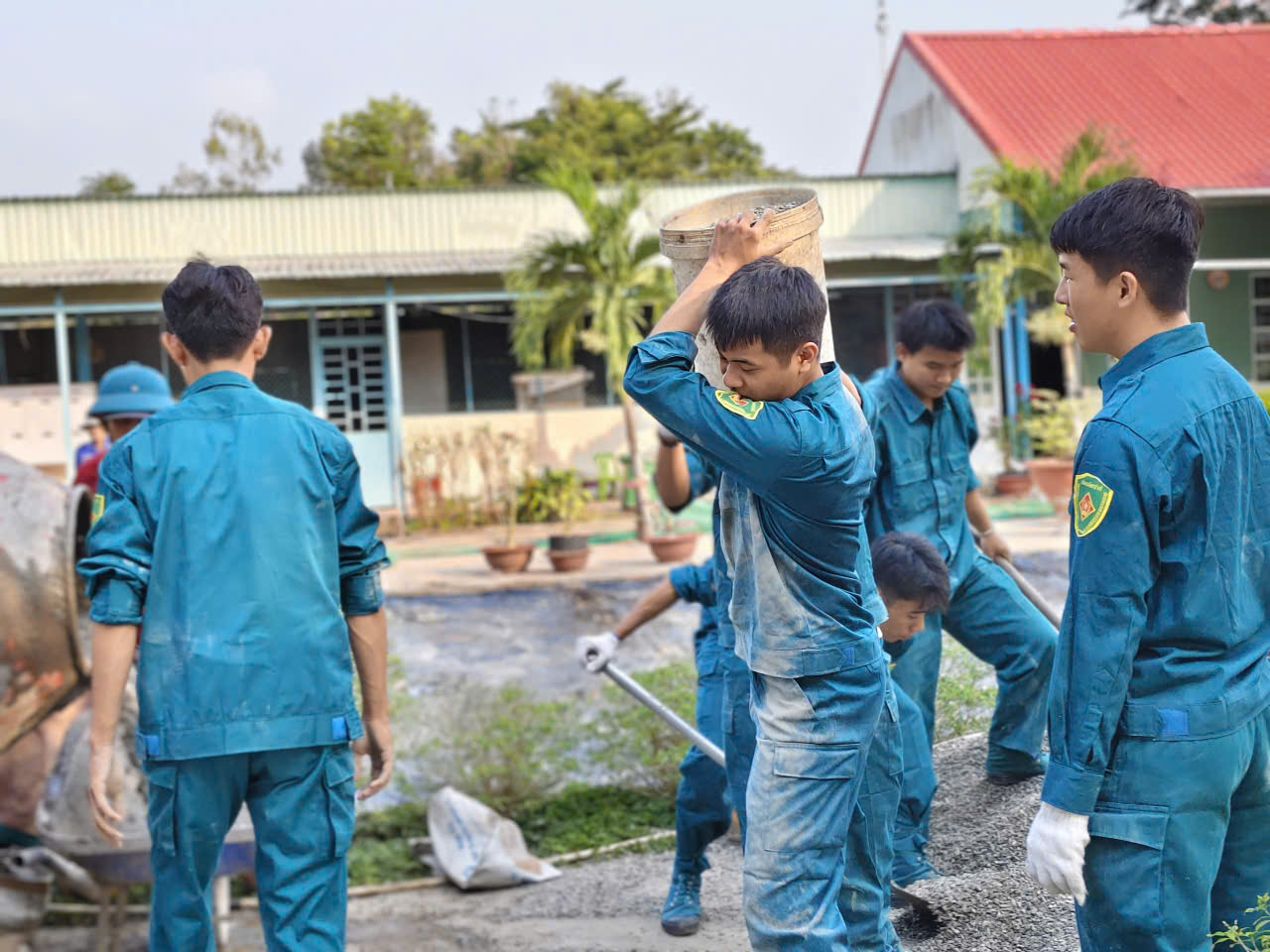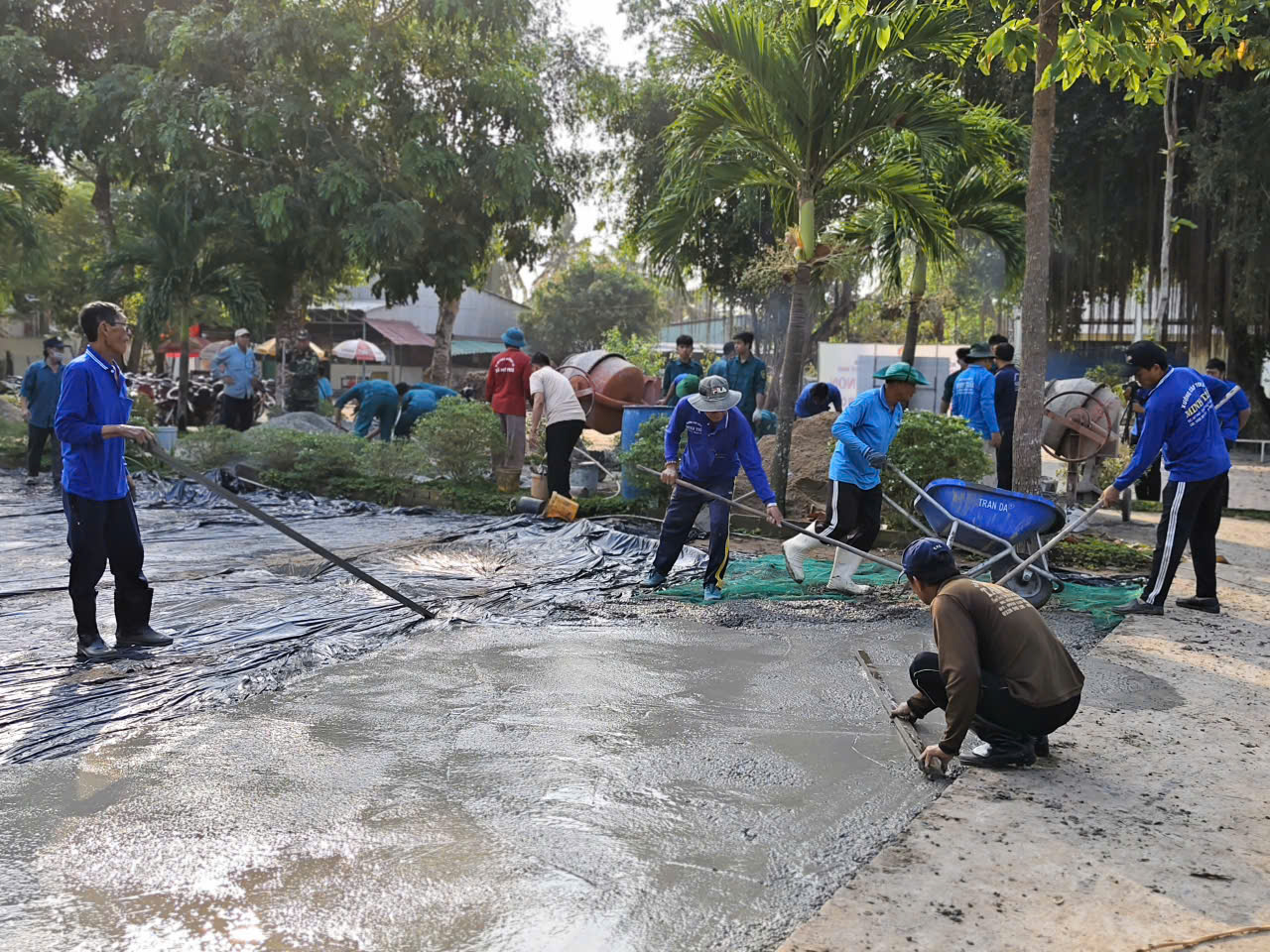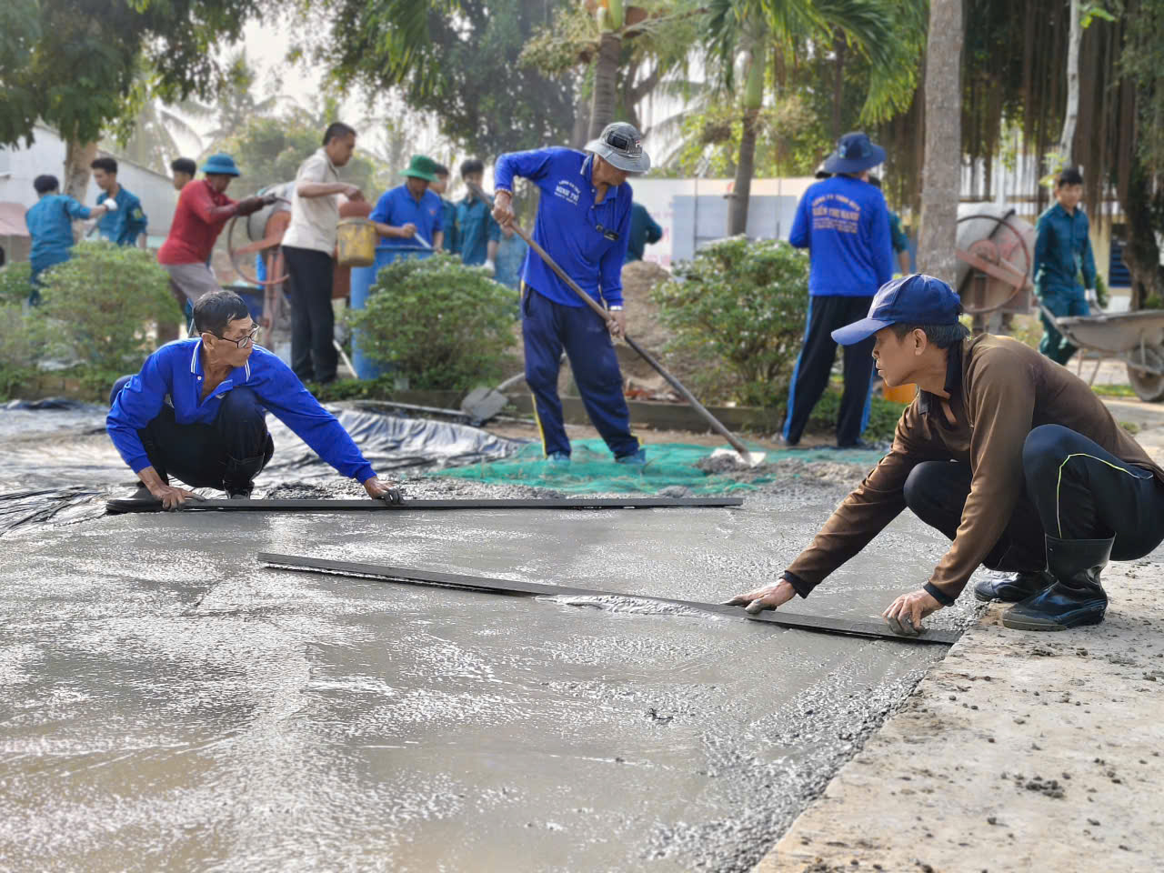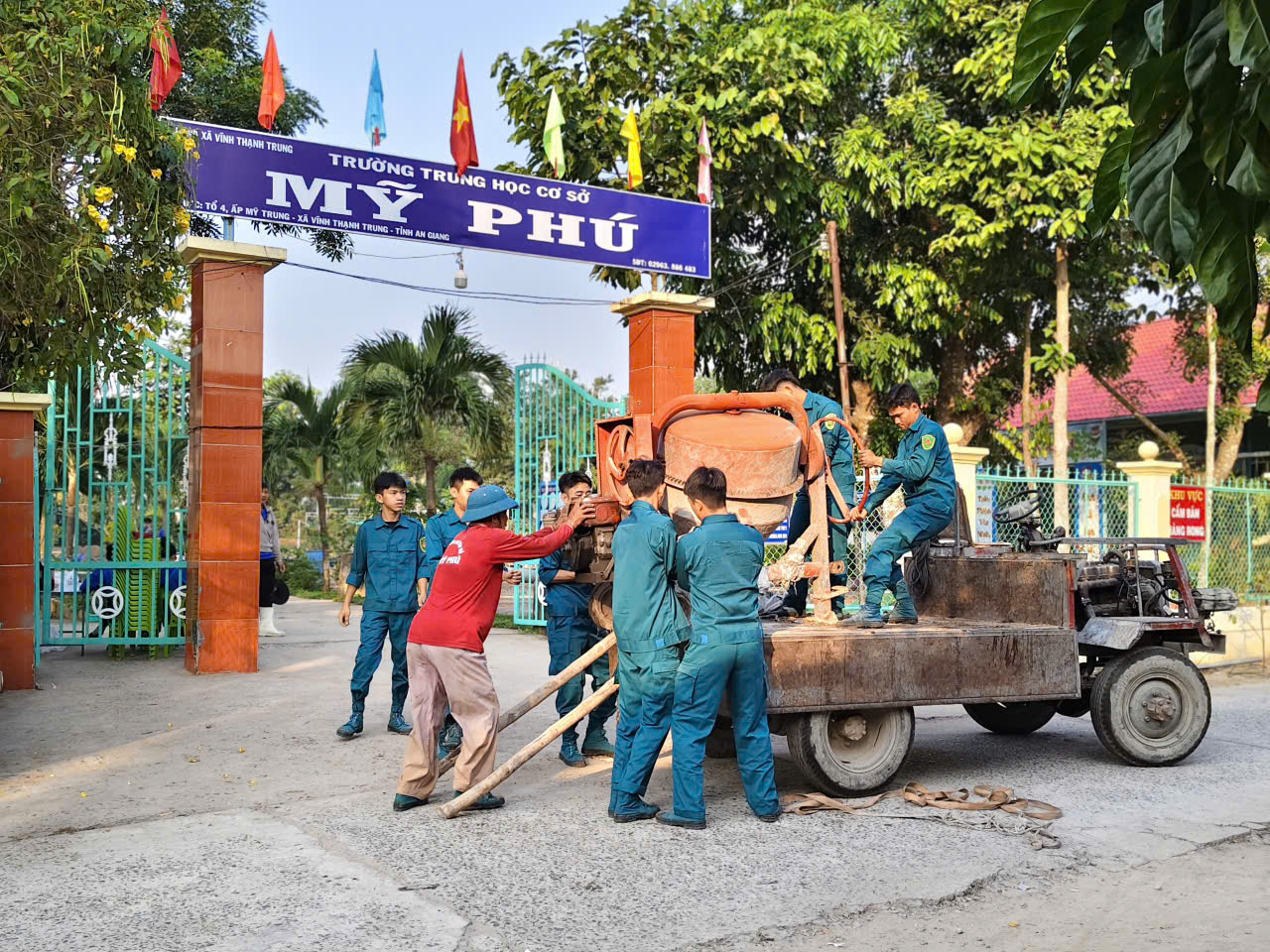Thực hiện phần việc đổ bê tông sân trường THCS Mỹ Phú