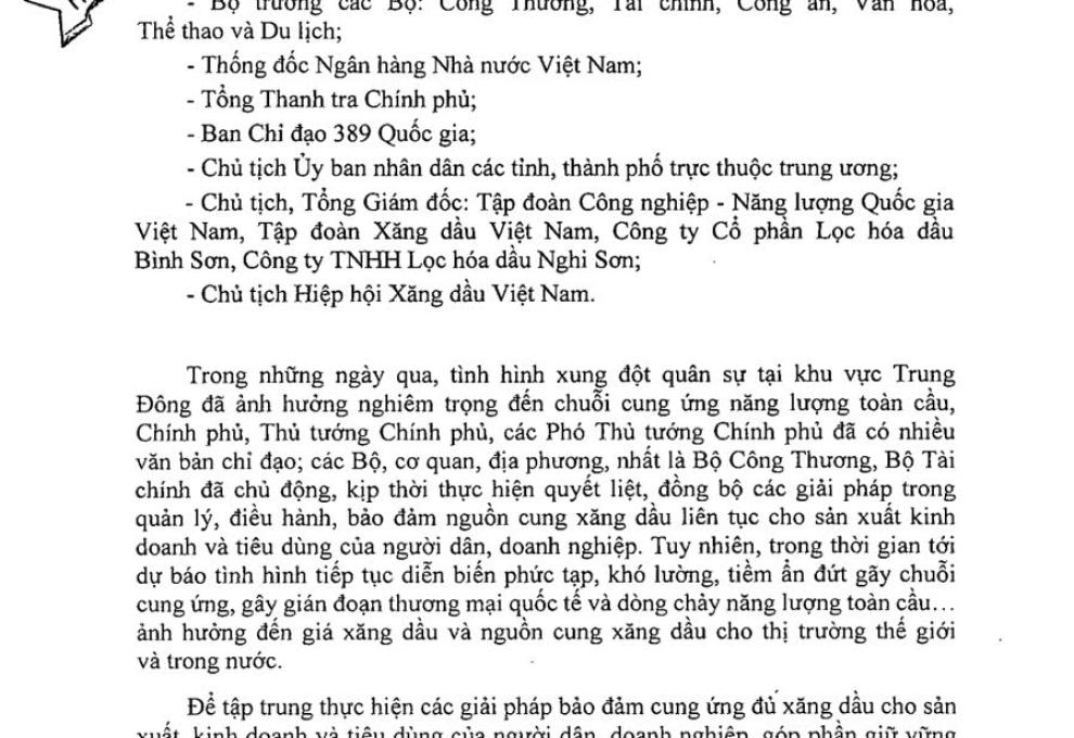 Thủ tướng Chính phủ đã ký ban hành Công điện số: 22/CĐ-TTg, ngày 11 tháng 03 năm 2026 Về việc tăng cường các giải pháp bảo đảm cung ứng xăng dầu cho sản xuất, kinh doanh và tiêu dùng của người dân, doanh nghiệp.
