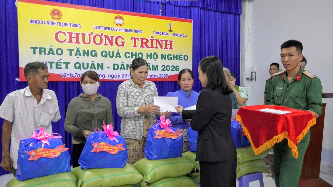 Tại buổi lễ, để ghi nhận những đóng góp thiết thực trên, UBND xã Vĩnh Thạnh Trung đã trao tặng quà lưu niệm cho đại diện Trung đoàn 1, thay lời tri ân sâu sắc của Đảng bộ, chính quyền và Nhân dân địa phương đối với những tình cảm và trách nhiệm của cán bộ, chiến sĩ dành cho địa phương.