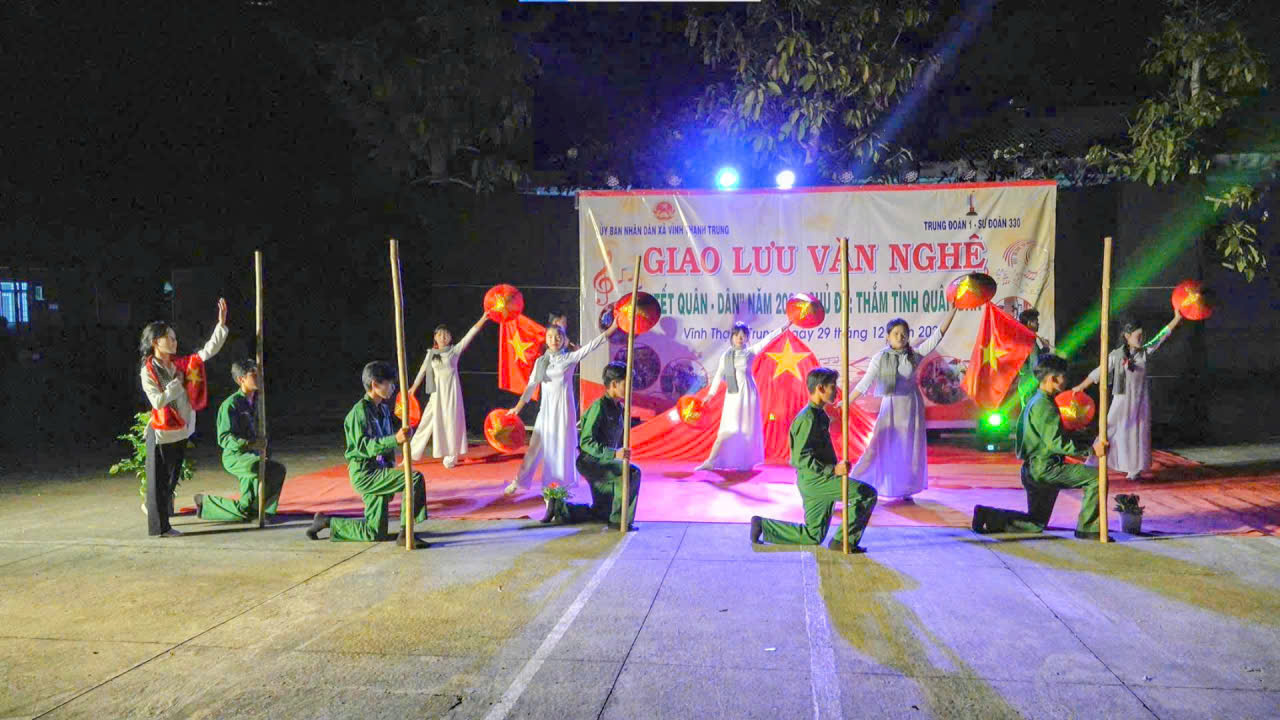 Đêm giao lưu có sự tham dự của Lãnh đạo địa phương, Ban Chỉ huy Trung đoàn 1 cùng hơn 150 cán bộ, chiến sĩ và đông đảo bà con nhân dân. Trong không khí hân hoan của những ngày cuối năm, khán giả đã được thưởng thức một không gian âm nhạc đặc sắc. Từ những ca khúc hào hùng như “Linh thiêng Việt Nam”, sâu lắng như “Người gieo mầm xanh” đến các bài ca cổ thắm đượm tình quê và các tiết mục nhảy hiện đại sôi động, tất cả đã tạo nên một đêm giao lưu văn nghệ đầy sắc màu.
