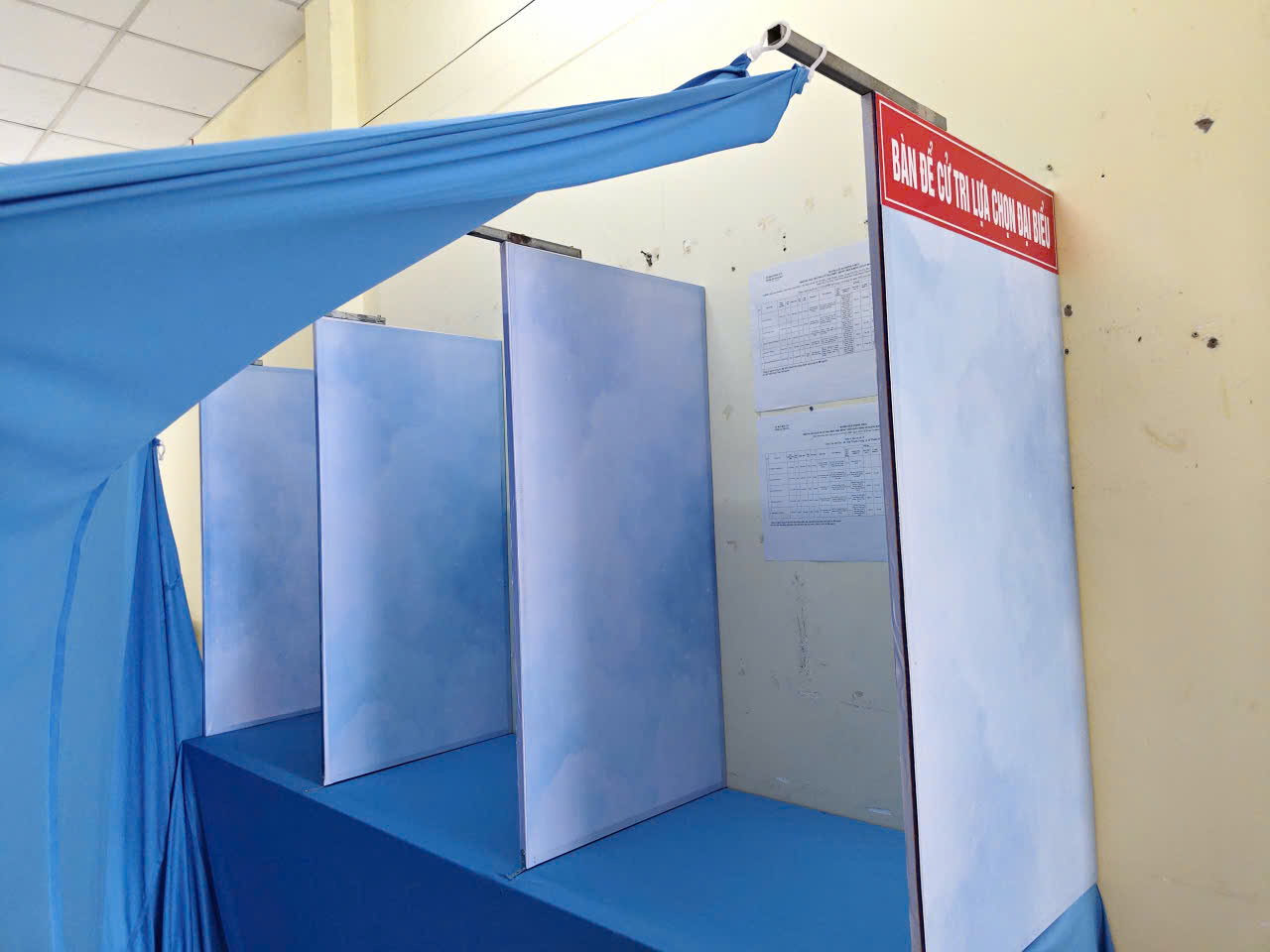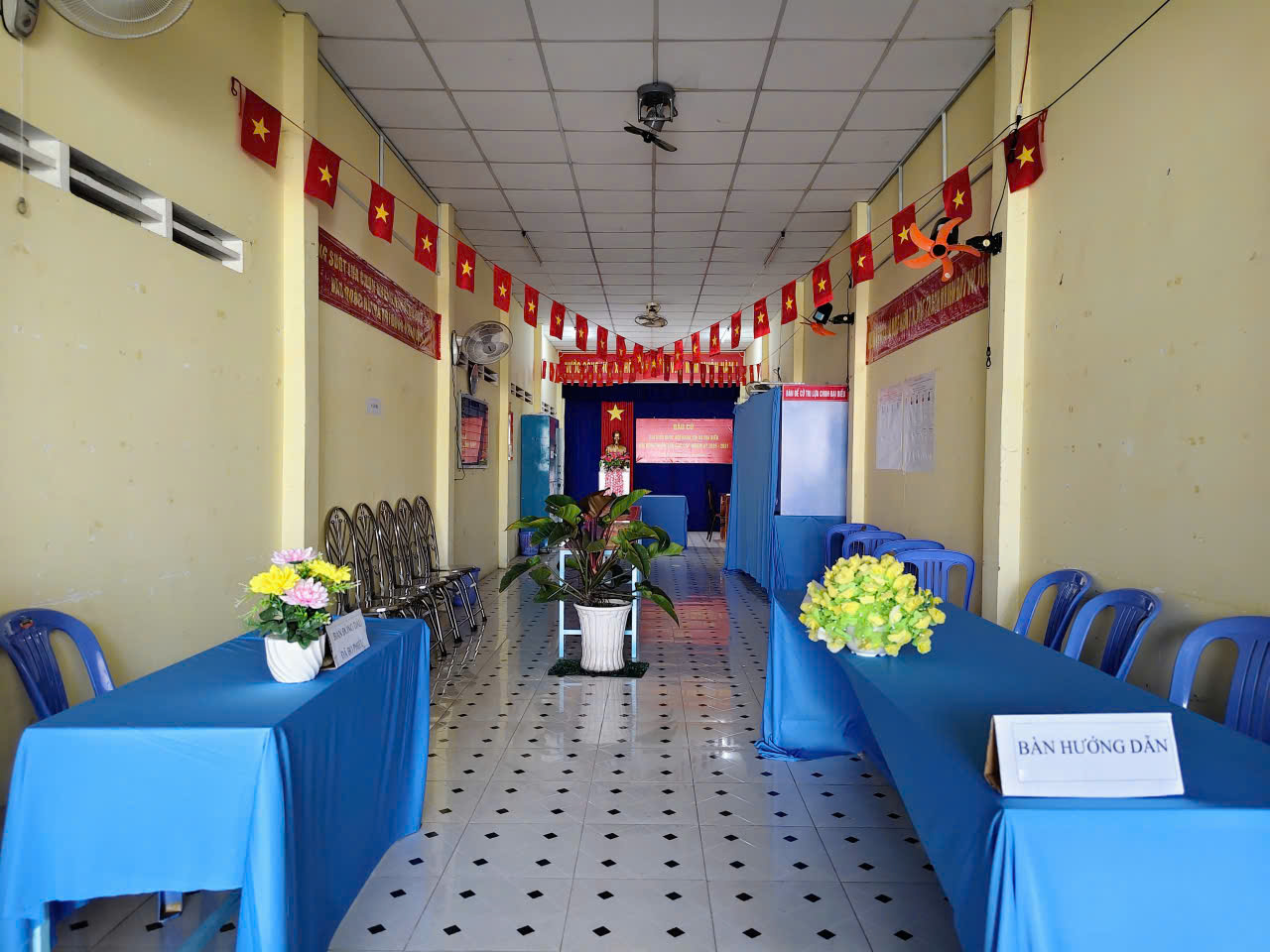 Bên trong phòng bỏ phiếu, các khu vực chức năng được bố trí khoa học, hợp lý theo quy trình một chiều. Từ bàn hướng dẫn, bàn đối chiếu danh sách cử tri, bàn phát phiếu bầu đến bàn đóng dấu “đã bỏ phiếu” đều được sắp xếp rõ ràng, có phân luồng lối vào, lối ra cụ thể. Các bàn gạch phiếu kín được chuẩn bị đầy đủ, bảo đảm nguyên tắc bỏ phiếu trực tiếp và kín,…