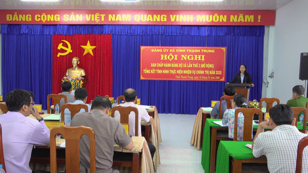 Chiều ngày 12/1, Đảng ủy xã Vĩnh Thạnh Trung tổ chức Hội nghị Ban Chấp hành Đảng bộ xã (mở rộng) nhằm tổng kết tình hình thực hiện nhiệm vụ chính trị năm 2025 và triển khai phương hướng, mục tiêu cho năm 2026. Đồng chí Nguyễn Duy Đức, Bí thư Đảng ủy, Chủ tịch HĐND xã chủ trì hội nghị.