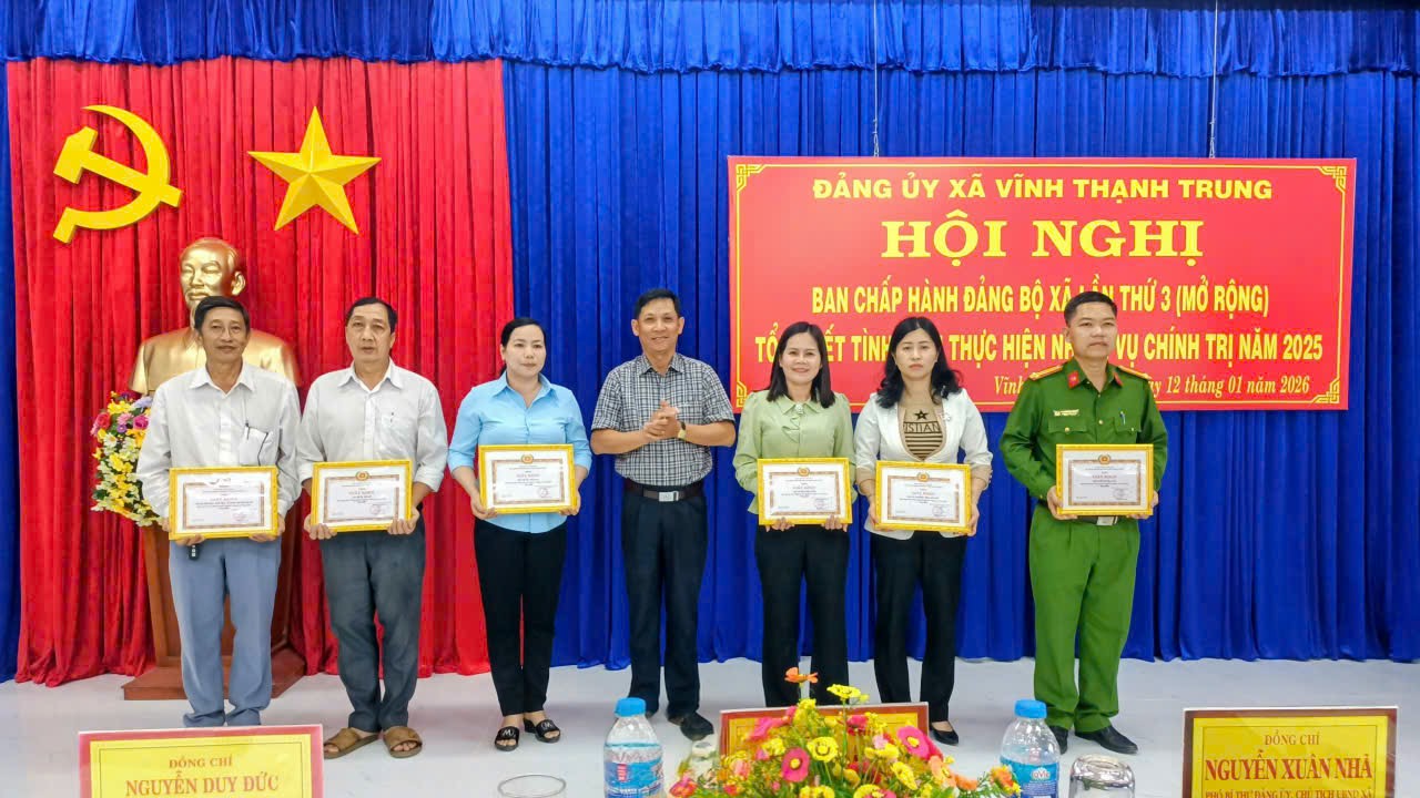 Ghi nhận những nỗ lực trong năm qua, dịp này, Ban Thường vụ Đảng ủy xã Vĩnh Thạnh Trung đã khen thưởng 06 chi, đảng bộ và 83 cá nhân có thành tích “Hoàn thành xuất sắc nhiệm vụ năm 2025”. Đây là nguồn cổ vũ lớn lao để cán bộ và Nhân dân xã nhà tiếp tục thi đua, xây dựng Vĩnh Thạnh Trung ngày càng phát triển.