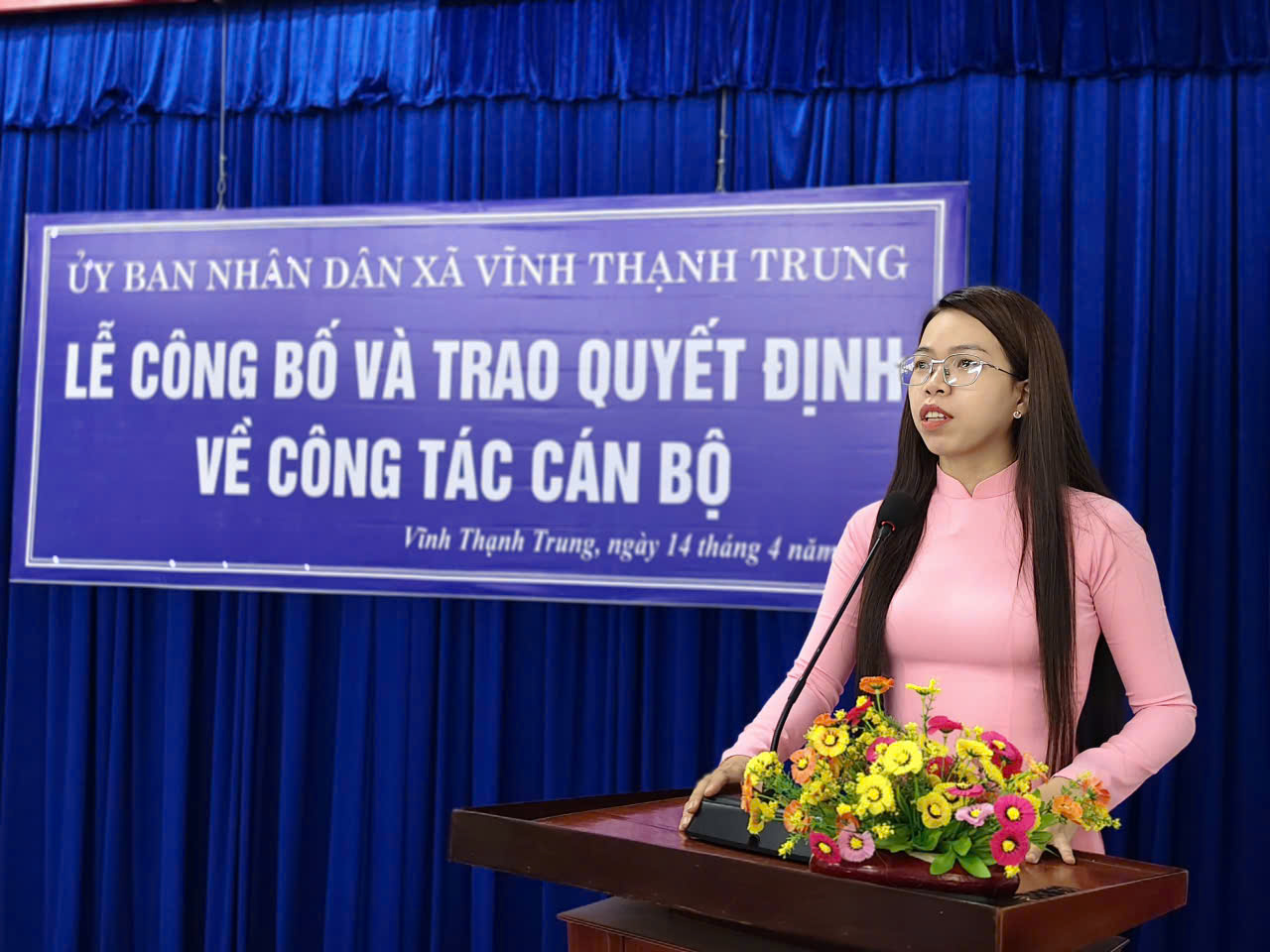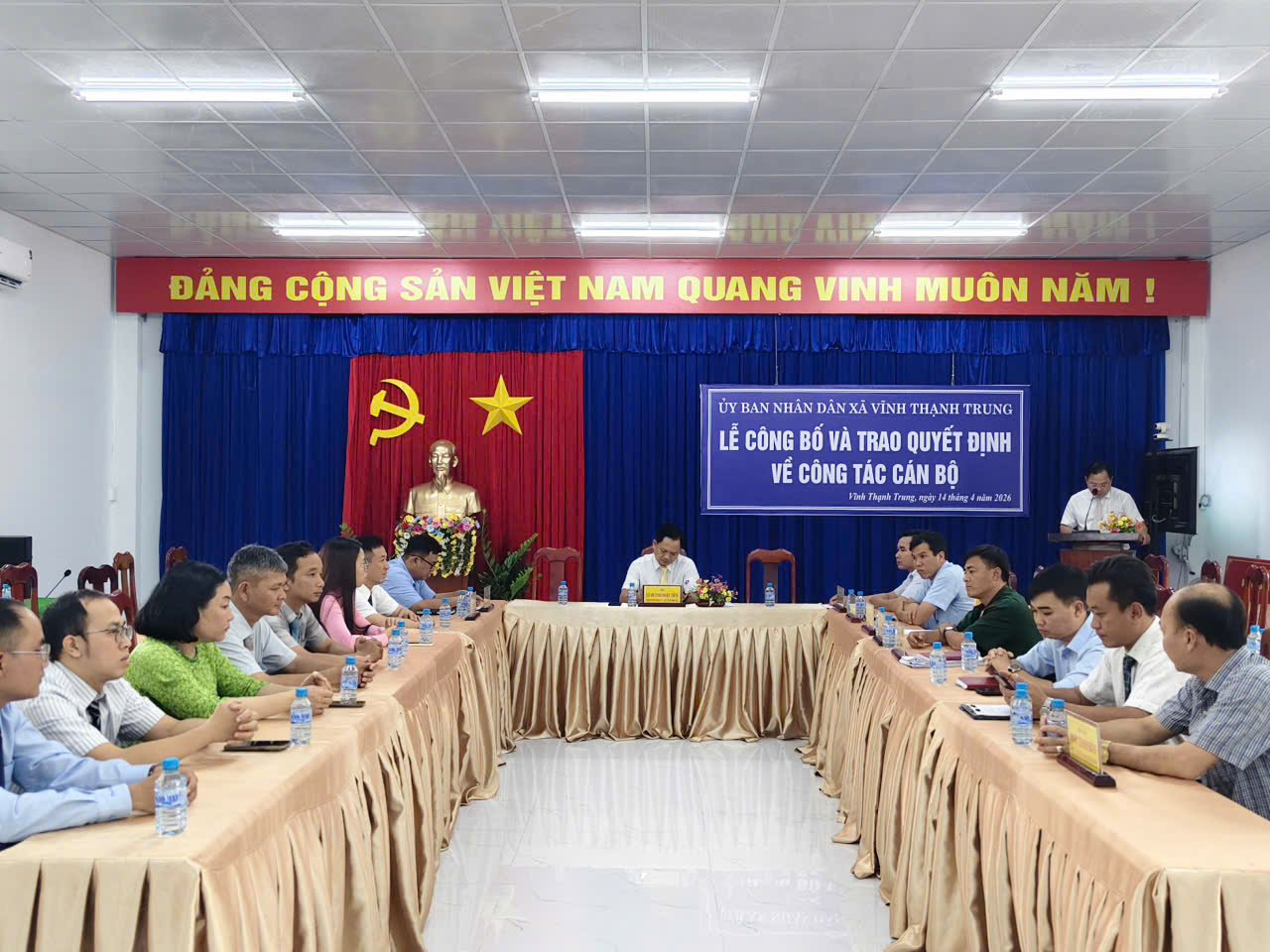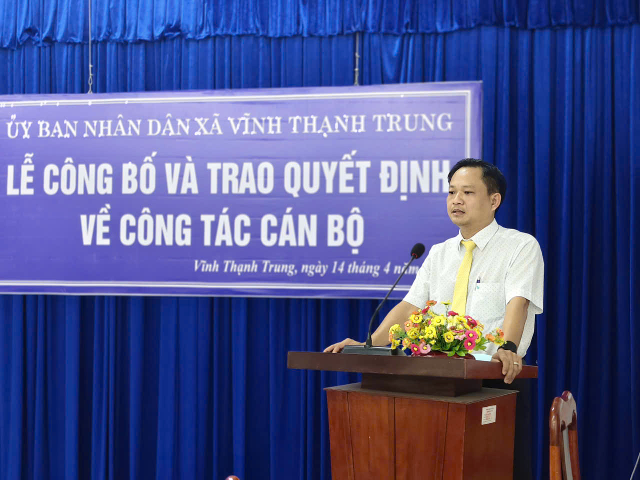 Chiều ngày 14-4, UBND xã Vĩnh Thạnh Trung đã tổ chức buổi Lễ công bố, trao quyết định về công tác cán bộ. Tham dự có ông Lý Huỳnh Nhật Tiến – Phó Bí thư Đảng ủy, Chủ tịch UBND xã, cùng các đồng chí lãnh đạo HĐND, UBND và Ban Xây dựng Đảng của xã.