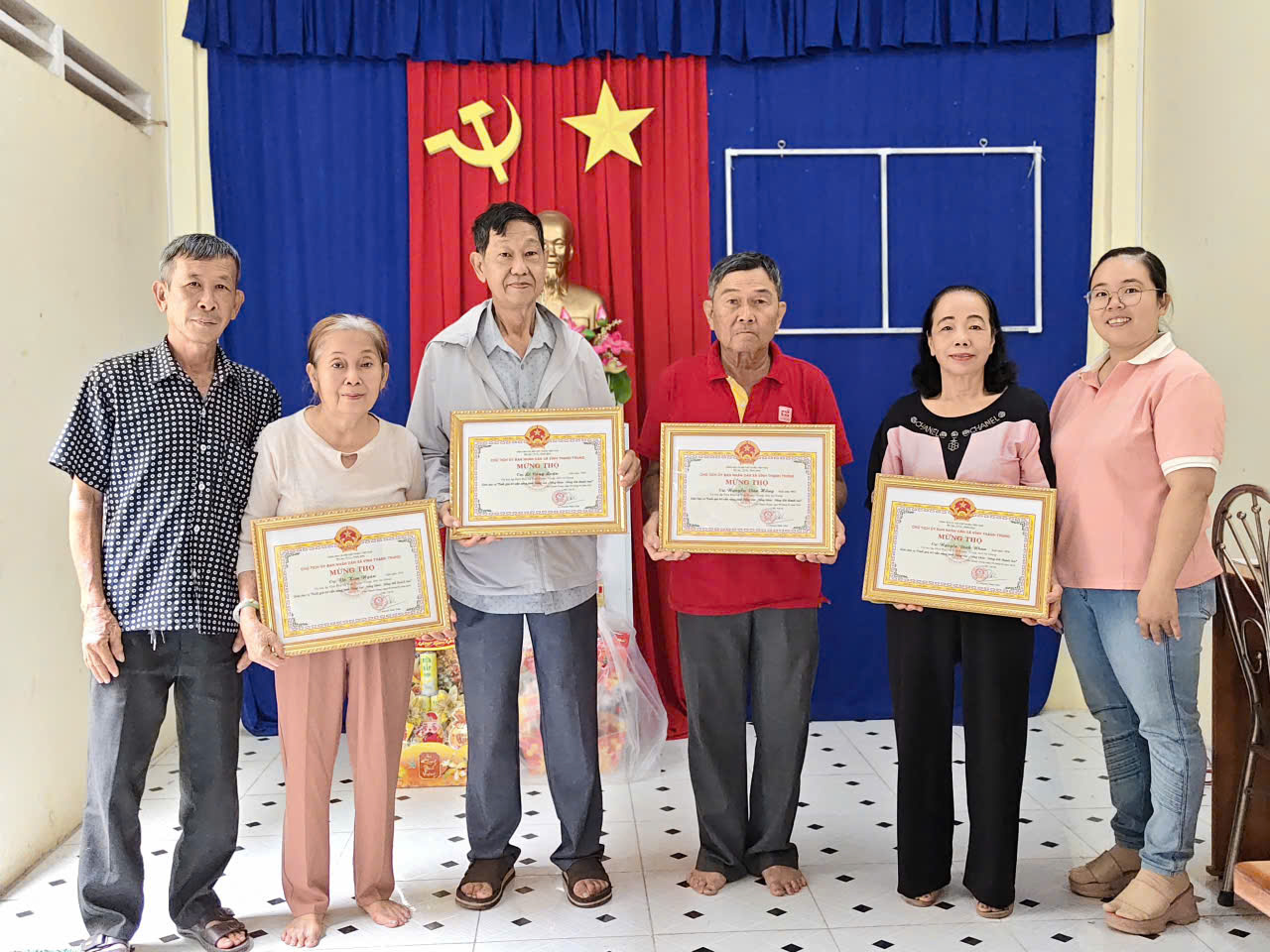 Bên cạnh các hoạt động tại trung tâm xã, ban lãnh đạo các ấp trong xã cũng đã tổ chức các buổi họp mặt thân mặt, tổ chức các đoàn đến tận nơi để trao Bằng mừng thọ và thăm hỏi những cụ không có điều kiện đi lại, đảm bảo sự quan tâm được lan tỏa đến từng hộ gia đình.